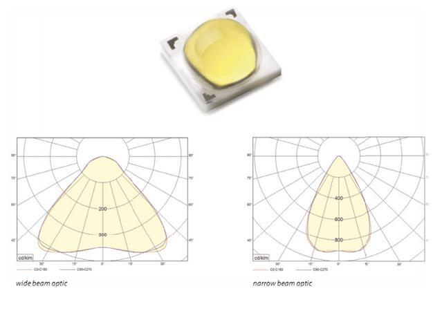 กราฟด้านล่างแสดงถึง การกระจายตัวของแสงแบบกว้าง (wide beam optic) และแบบลึก (narrow beam optic) เพื่อความเหมาะสมของการใช้งานของลูกค้า